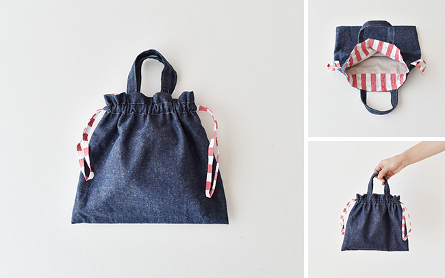 お財布、携帯、ポーチ、読みかけの本などもすっぽりと入る、ちょっとしたお出かけにぴったりの大きさの巾着トートを作ります。 先日workroomでのイベント「50+50の鍋つかみ展」でもワークショップを開催して大好評だったアイテムとなります。 デニム生地とちらりと見えるストライプがアクセントになっています。 秋の手芸時間を一緒に楽しみましょう。みなさまのご参加をお待ちしています。