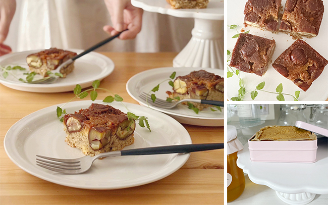 栗とキャラメルソースが、アールグレイの入ったバターケーキ生地に染み込んで、香りの良いケーキに仕上げます。