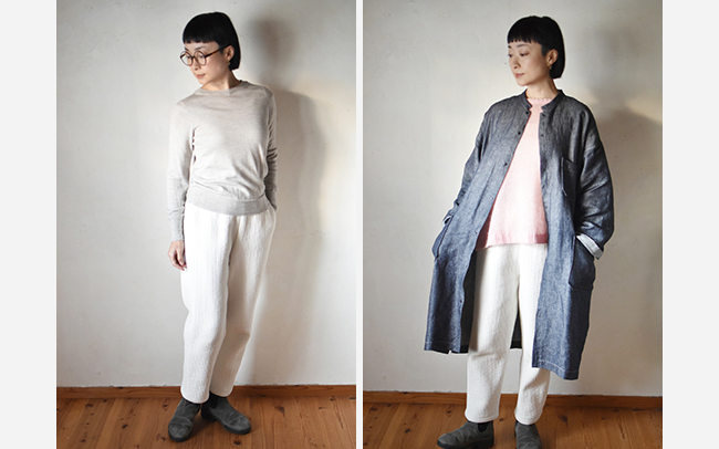 美濃羽まゆみさんによるヌビキルトで作るあったかパンツのワークショップです。 やわらかなコットンに中綿が入ったヌビキルトはとても暖かく、この時期に嬉しいパンツです。 ヒップ周りはゆったり、裾は細めですっきり。 きれいなシルエットと着心地にこだわった一本です。 「NHKすてきにハンドメイド」でも紹介され反響の大きかった作品です。 ウエストは総ゴム仕上げで、調節できる紐付き。サイドにはシームポケットもついています。 まだまだ寒い季節に活躍間違いなしのキルトパンツを是非作ってみませんか。 みなさまのご参加をお待ちしております。 生地は下記を使用します。 ヌビキルトクム きなり <サイズ>S/M/L/LL/XL ヒップ:91/95/99/103/107㎝ 着丈:91/93.5/95/96.5/98㎝ わたり幅:32/33/34/35/36㎝ 裾幅:15.5/16/16.5/17/18㎝ ※モデルは身長162㎝、Mサイズ着用 ※丈の調節も承ります。お申し込み時に備考欄に記載ください。 ご予約はインターネット上のオンライン予約で承ります。 事前に会員登録を済ませておかれますと、受付開始後、スムーズにご予約していただけます。 画面上部の「会員新規登録」より、会員登録画面にお進みください。(会員登録は無料です。) --------------------------------------------------------- 開催日 2026.1.25.sun 10:15 ー 14:30 ※受付はワークショップ開始の10分前からとなります。 --------------------------------------------------------- | 講師 | 美濃羽 まゆみ 京都の町家で家族4人、猫2匹と暮らす。2008年からFU-KO basics.として販売、オーダー受注会を行い、シンプルで着心地の良い子供服・大人服をひとつひとつ手づくりしている。 手づくり暮らし研究家として「ものを作る、しあわせの形を作る」をテーマに活動も行い、手づくりのある丁寧な暮らしを提案している。著書に「FU-KO basics. みんなで着たい、手づくり服(Heart Warming Life Series) ](ヴォーグ社)がある。 | 定員 | 6名 | 参加費 | ¥15400(14000+税)(講習費、材料費、お茶代込み) | 持ち物 | まち針、糸きりばさみ、裁ちばさみ、定規、筆記用具 | 場所 | CHECK&STRIPE fabric&things(芦屋) | ご参加方法 | ご予約はインターネット上のオンライン予約で承ります。 1月11日(日)9:30〜受付開始いたします。 受付開始をしますと、本ページの一番下に「予約ボタン」が表示されますので、そちらよりご予約下さい。 満席の場合は、ボタンが「キャンセル発生お知らせメールの配信を希望」と表示されます。 キャンセルが出た場合のお知らせメールをご希望のお客様は、そちらにお進みください。 ※お知らせメールの登録をされた方が優先的に予約をとれる機能ではございません。予めご了承ください。 インターネット上からのご予約は、材料準備の関係で開催5日前の深夜24:00で締め切らせて頂きます。 それ以降のご予約は、各店舗へ直接お問い合わせください。 | ご注意 | ※お子さまと一緒のご参加はご遠慮ください。 ※キャンセルはご遠慮ください。 ※予測できない事情(天候不順)などのために休講になる場合がございます。予めご了承ください。 ※1回の予約で1席分の予約ができます。また、1つの会員IDで同一のワークショップを1席のみ予約できます。 ※同一ワークショップを複数席予約したい場合(ご友人同士で。兄妹でキッズワークショップのご参加等)は、お手数ですが複数の会員IDで1席ずつ予約いただくか、会員登録せずに異なるご予約氏名で1席ずつ予約をお取りください。 ※ご予約操作中に満席になる場合がございます。予めご了承ください。