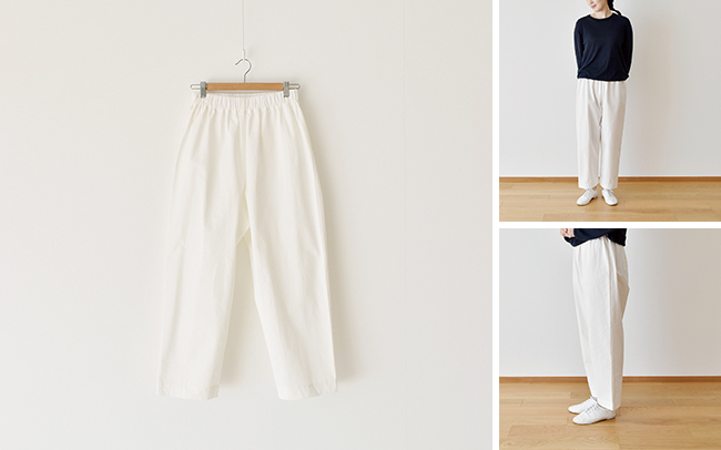 新刊『CHECK & STRIPE My Sewing Life』(世界文化社)より、「ゆったりテーパードパンツ」を作ります。 ゆとりのあるシルエットでありながらすっきりとした、股上深めの着心地よいパンツです。 驚くほど簡単に作ることができますので、ぜひ生地を変えてたくさん作っていただきたい一着です。 難しいポケット付けやベルト付けがないため、初心者の方も安心して取り組むことができますので、ワークショップに初めてお越しの方にもおすすめいたします。 今回は書籍に掲載されている生地をそのままワークショップに用いています。 サンプルを店頭にご用していますので、ぜひ手にお取りになってご検討くださいませ。 みなさまのご参加をお待ちいたしております。 出来上がりサイズ(S/M/Lの順に) ウエスト 107 / 111 / 116 cm 股上 34 / 35 / 36 cm 股下 58.5 / 58.5 / 58.5 cm パンツ丈 95 / 96 / 97 cm ヒップ. 108.5 / 112.5 / 116.5 cm
