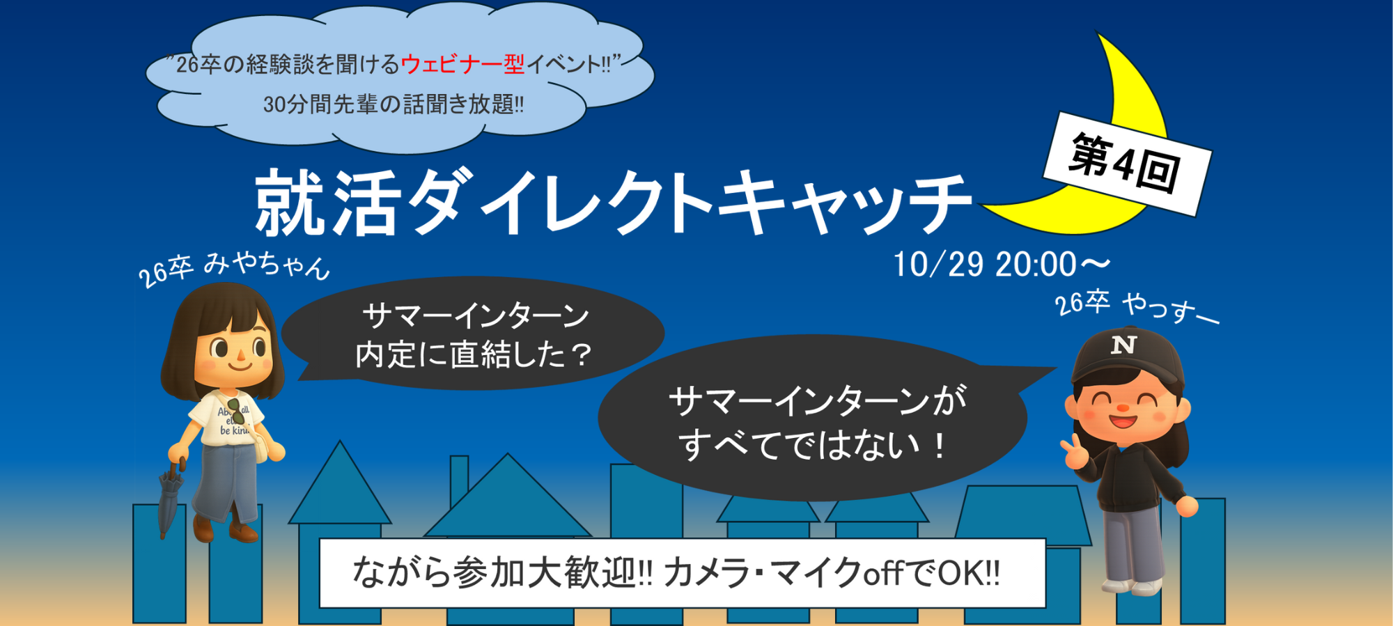 27卒28卒のあなたへ!! 就活ダイレクトキャッチを開催します! 就活をしていると孤独で辛い人、困っているけど何をするべきか悩んでいる人、誰でも大歓迎です!30分間の開催なのでお手軽に参加できます◎ 就活を終えた26卒の私たちから、皆さんに何か一つでも実りある時間を提供します! !