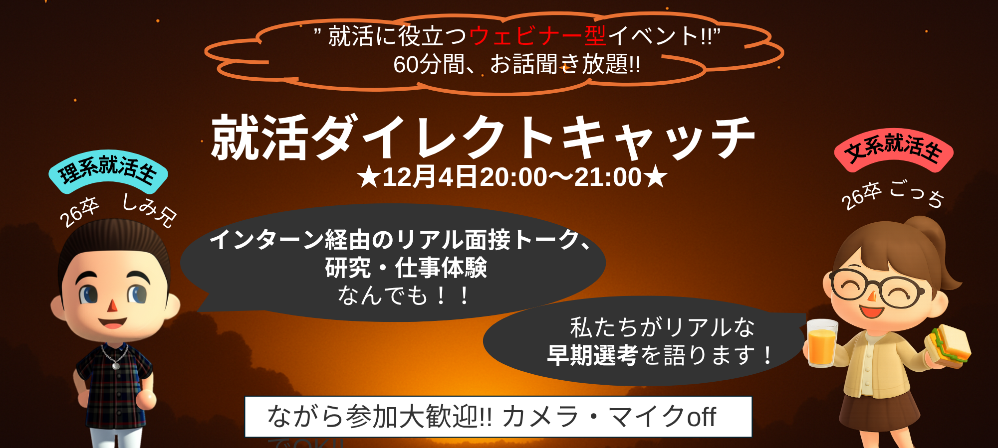 「インターン経由のリアル面接トーク、研究・仕事体験・企業選び」をテーマにお届けします! 文系元就活生のごっちと、理系元就活生のしみ兄が登壇します!本イベントは学生のみなので、本音の就活トークを聞くことができます!