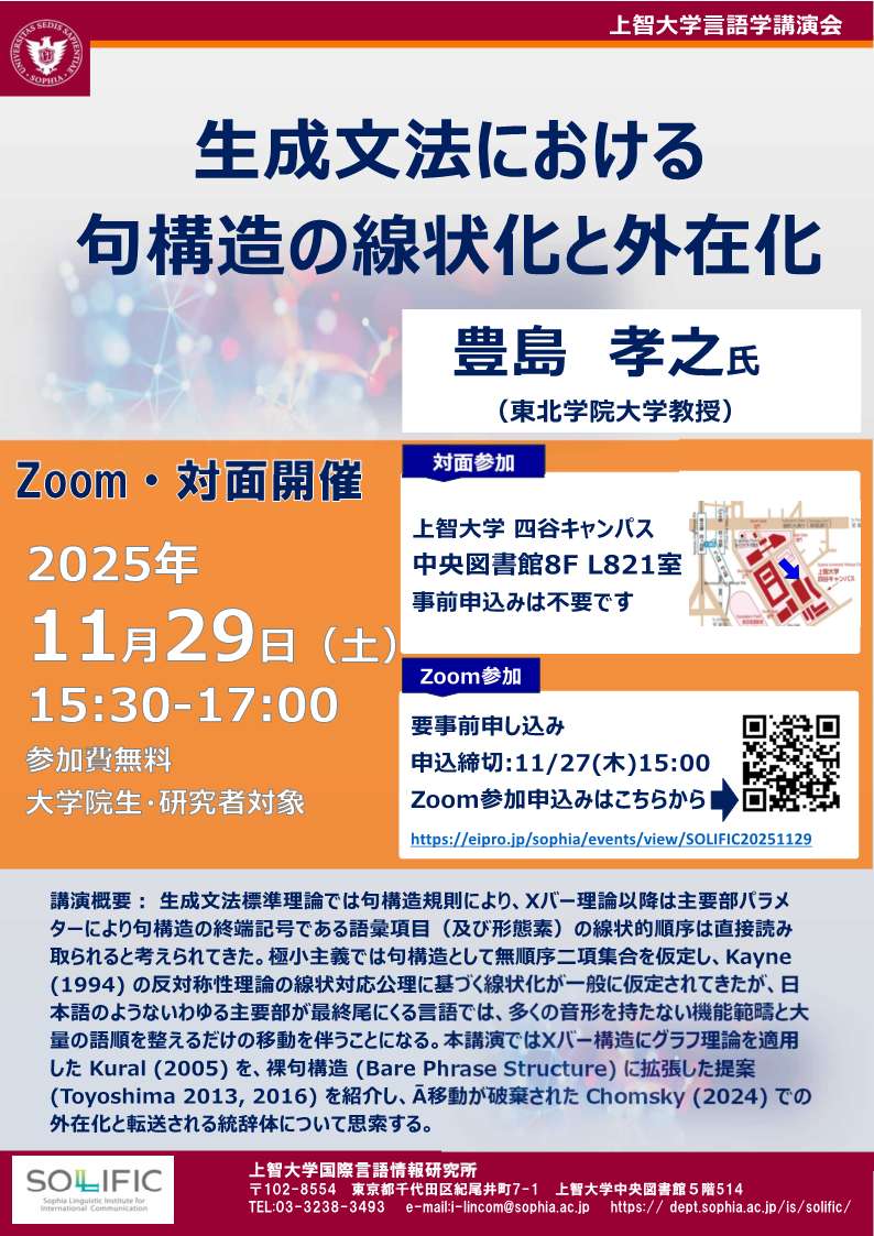 【言語学講演会】生成文法における句構造の線状化と外在化