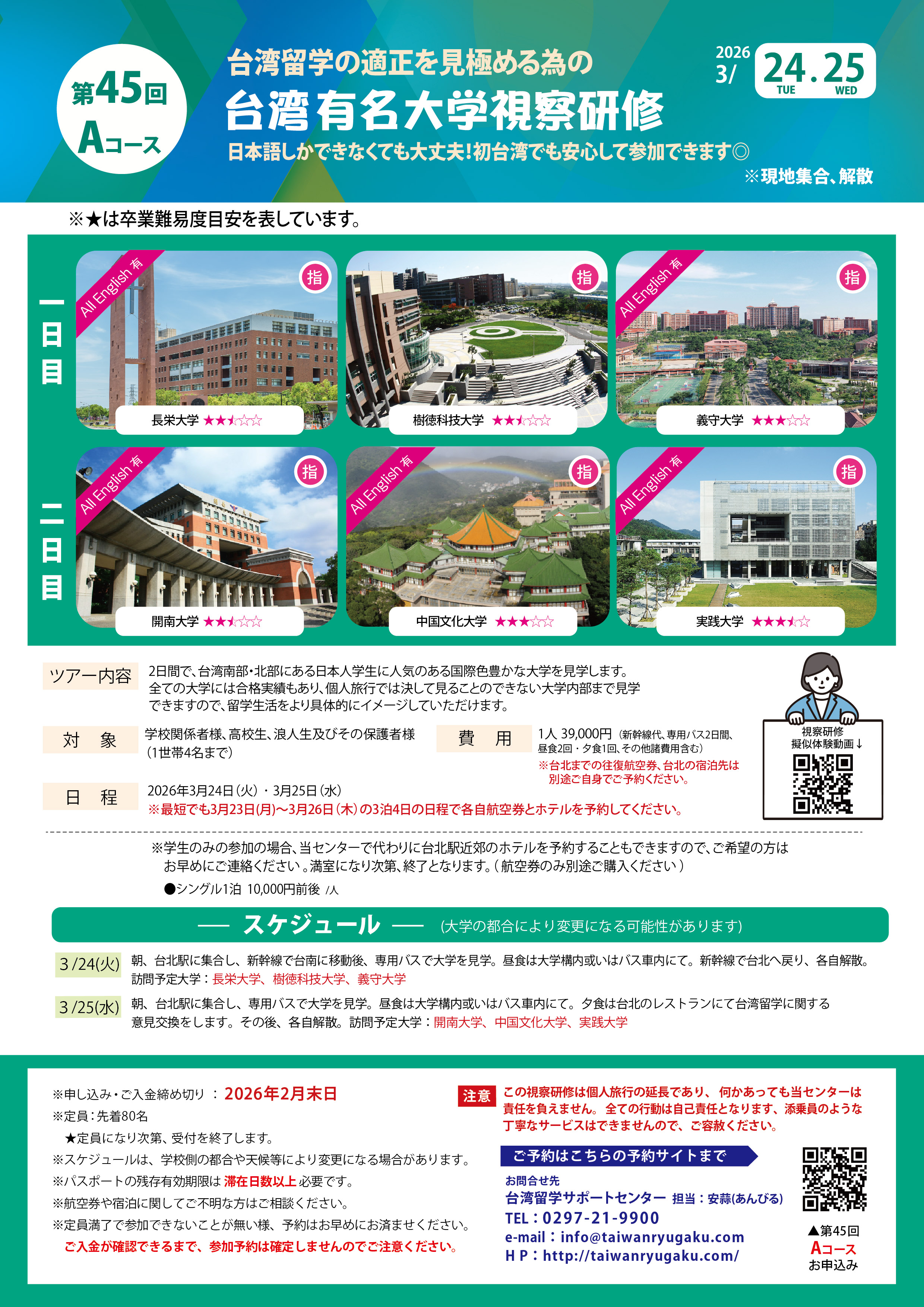 3月24日の朝に直接台北駅にて現地集合となりますので、パッケージツアー等と合わせて気軽に参加して頂くことができます。個人旅行では決して見ることのできない大学内部まで見学することができますので、留学生活をより具体的にイメージしていただけます。ただの下見旅行ではなく、現地の大学事情について学び、進学の際のトラブルを無くす為の研修です。それと同時に、大学への推薦に際して当センター内での事前審査を実施する大切な場ともなっていますので、進学までには必ず一度は参加してください。