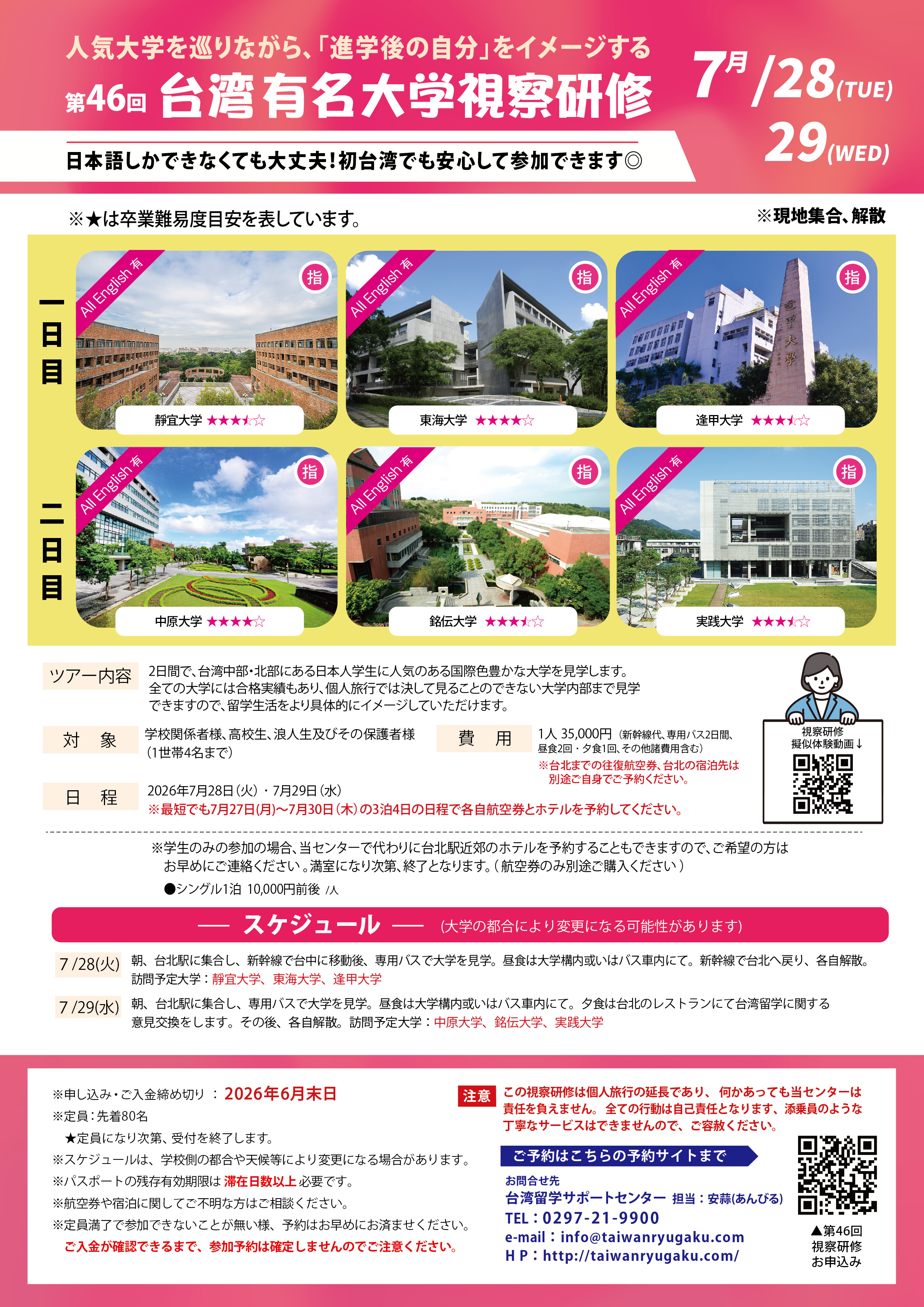 ¥35,000/人 (新幹線代、専用バス2日間、昼食2回、夕食1回(7/29)、その他諸費用含む) ※台北までの往復航空券、台北の宿泊先は別途ご自身でご予約ください。