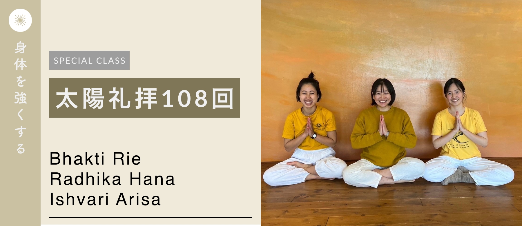 太陽礼拝108回 Arisa Ishwari/Hana Radhika/Bhakti Rie @TAMISA三条寺町スタジオ 一年の締めくくり!今年も太陽礼拝108回! 2025年も色んな出来事があったと思います。 太陽礼拝を行う中で、一年でくっついた溜まったものを浄化して、たっぷりと深いリラクゼーションで完全に手放していきましょう!最後に、純粋な歌、キールタンを皆で歌えば、きっと未来への希望で満ち溢れるはず! 手放した空っぽの心と体に、また新しい素敵なことが入ってくるでしょう! 今年もシヴァナンダシスターズが、優しく、時にそっと背中を押して、サポートさせて頂きます。体力の自信がない方も、ご自身のペースで休憩しながら行っていけますので、ぜひご参加頂ければと思います。 ※マンスリーパスの方は+1,650円
